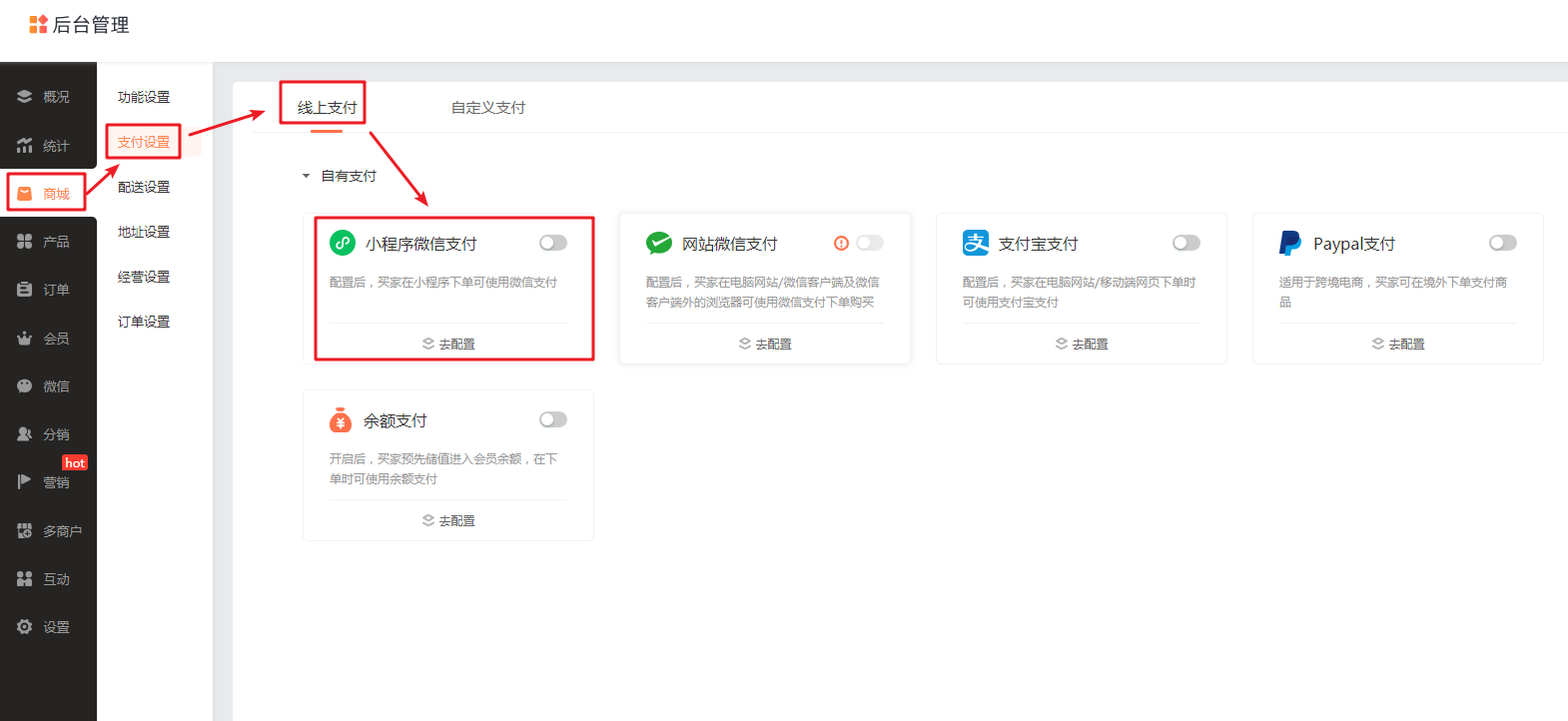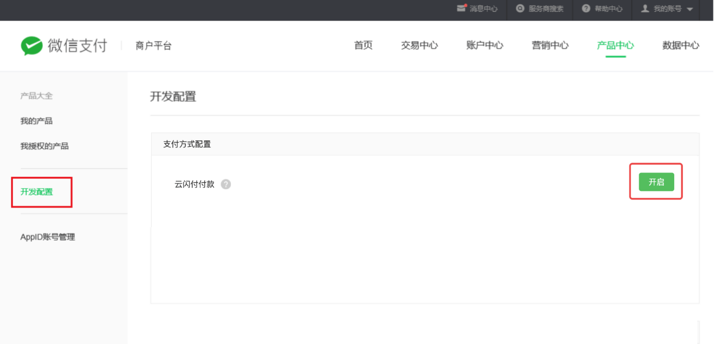 二、设置教程 1. 配置商城小程序微信支付 登录商城管理->支付设置->小程序微信支付(详细教程)配置完成,并启用小程序微信支付 2.商户平台开启功能 操作路径:登录【微信商户平台】->【产品中心】->【开发配置】页面,页面最底部找到【支付方式配置】,点击【开启】就可以了 3.支付效果