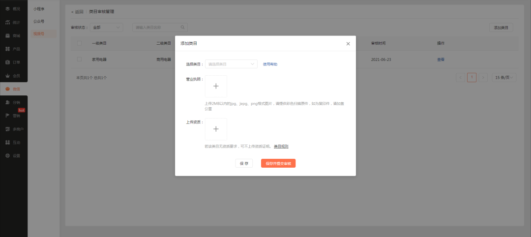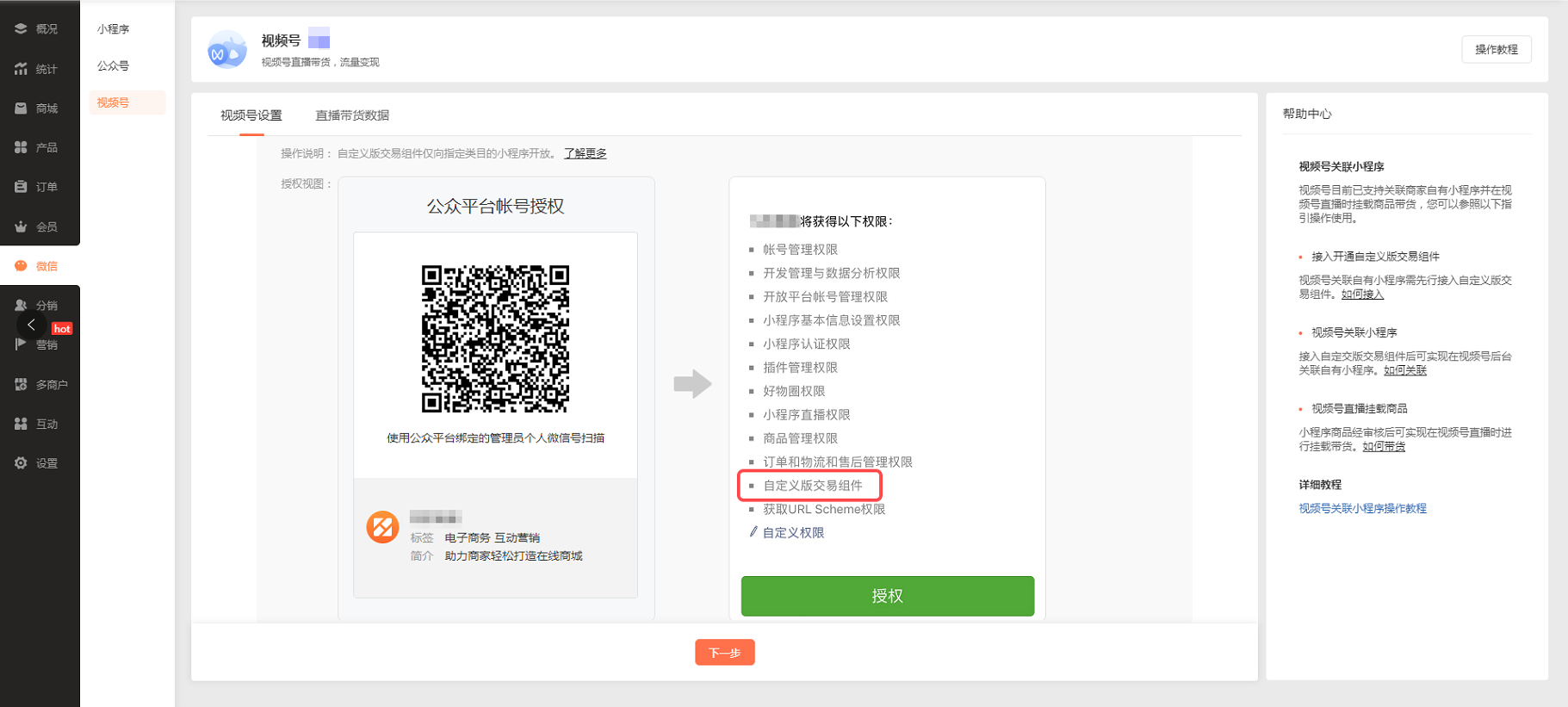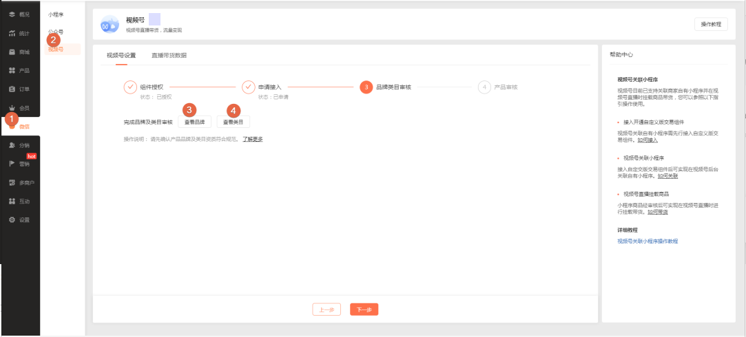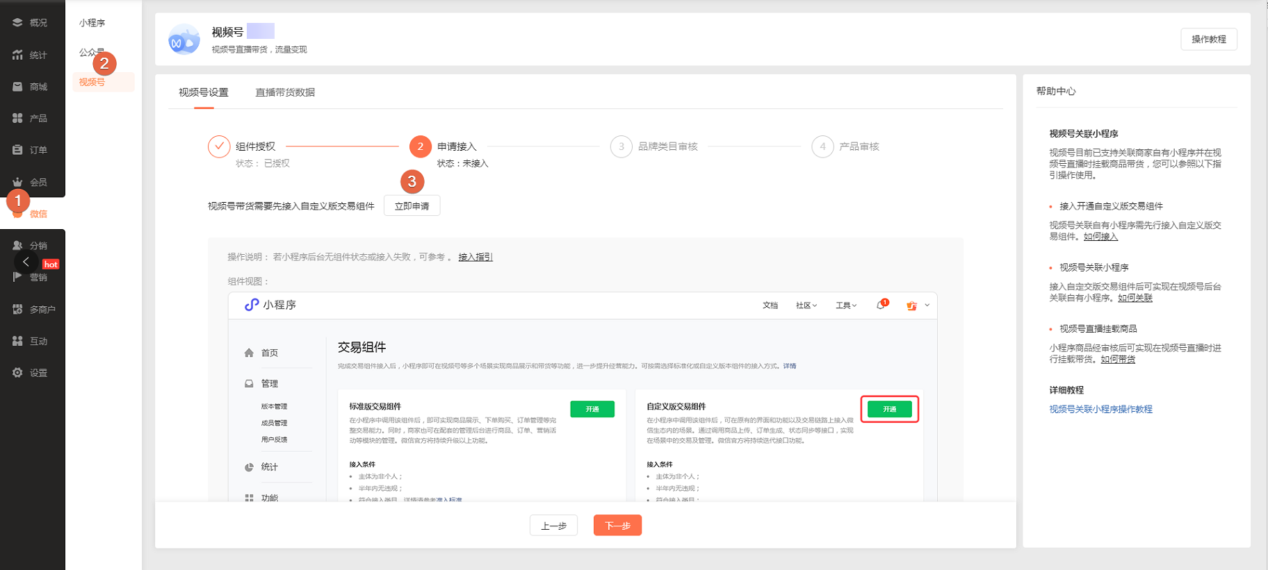 1. 商家可在「商城管理后台-微信-视频号-视频号设置」中申请接入自定义版交易组件。 >> 03 品牌类目审核