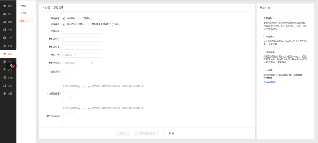 1. 商家可在「商城管理后台-微信-视频号-视频号设置」中查看品牌以及类目,完成品牌及类目审核。 2. 添加品牌时,商家需上传营业执照、商标注册证,填写品牌名称、商标注册人、商标注册号等信息。